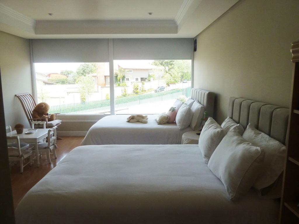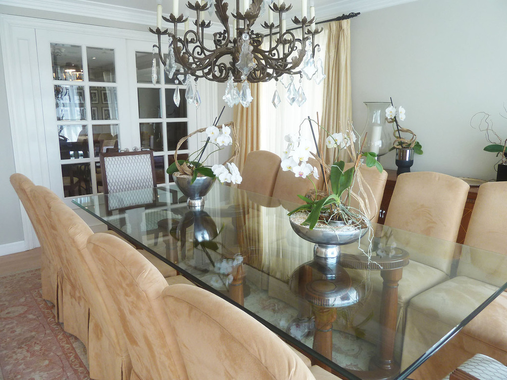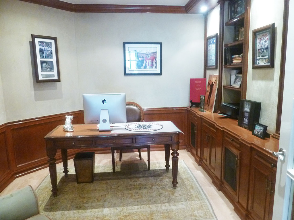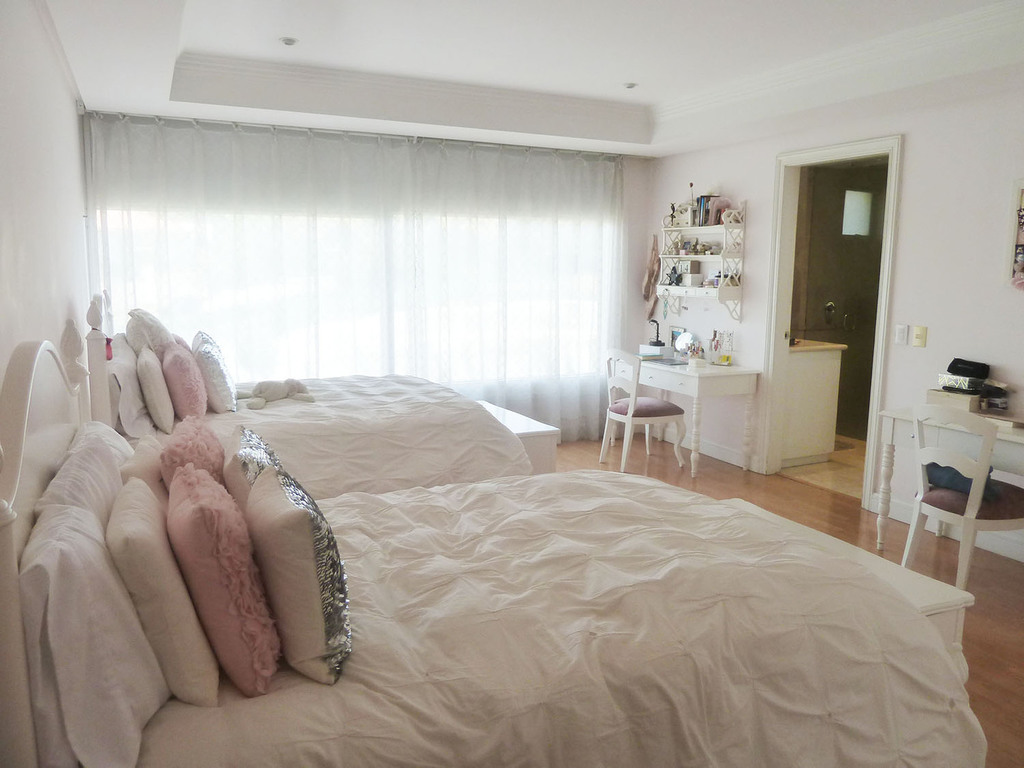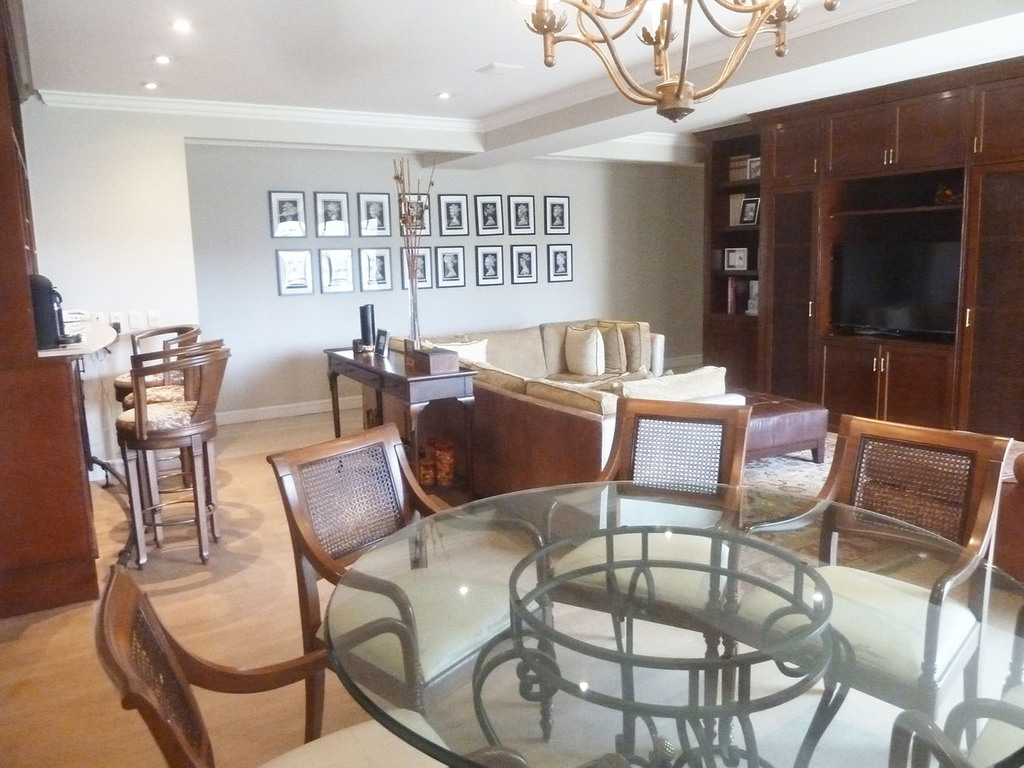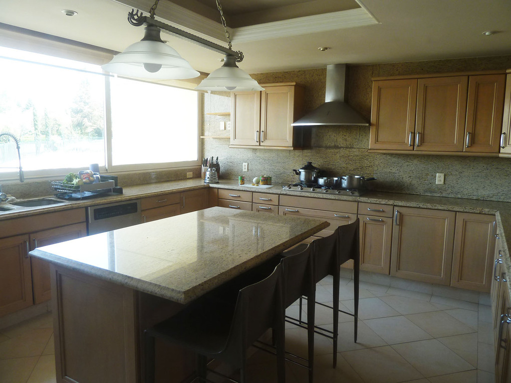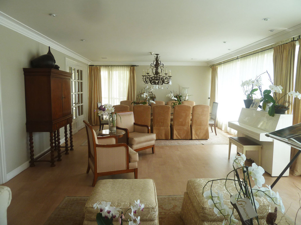 Entrada principal, elegante recibidor, baño de visitas, despacho, sala, comedor con vista a los jardines, family room con ante comedor y terraza, barra con bar, cocina integral con 2 despensas, en el pasillo doble closet de blancos, 3 amplias recámaras, cada una con vestidor y baño, 5 lugares de estacionamiento, 2 bodegas interiores, área de lavado y 2 cuartos de servicio.