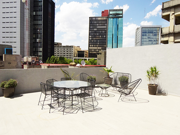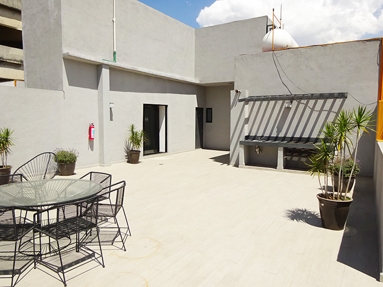 El edificio cuenta con roof garden con asador, mesas y sillas.