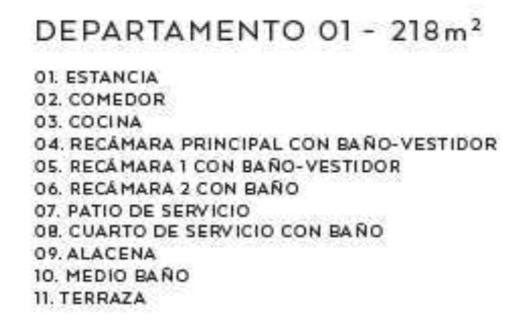 Departamento con finos acabados, sala, comedor, terraza, baño de visitas, cocina, 3 recámaras con vestidor y baño, área de lavado, cuarto de servicio con baño, 2 lugares de estacionamiento. Se entrega sin closets y sin canceles de baño.