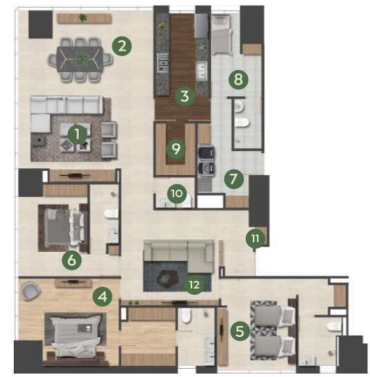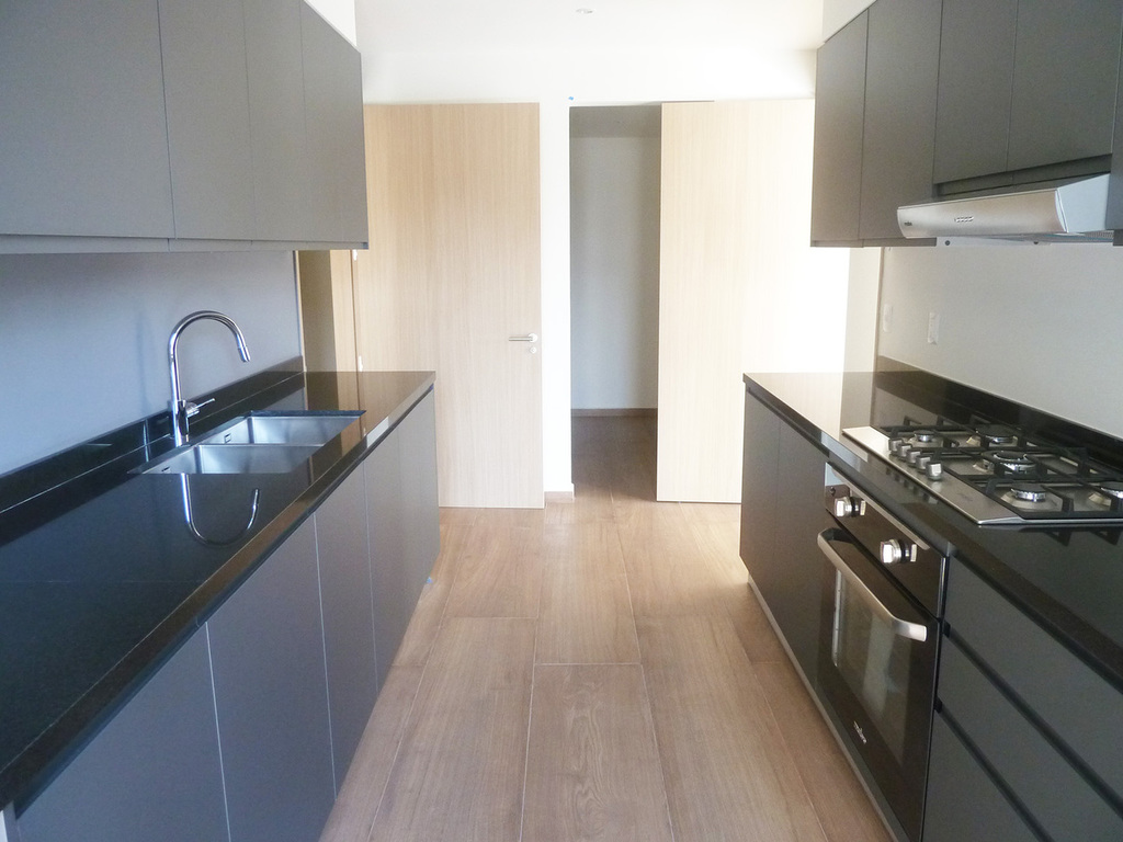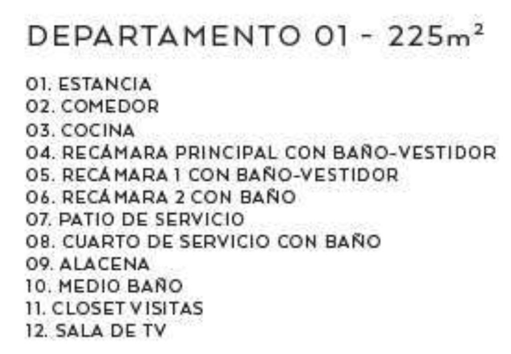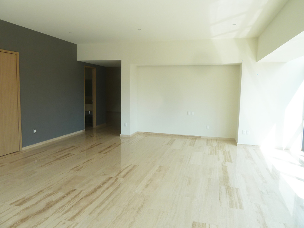Departamento con finos acabados, sala, comedor, baño de visitas, cocina, sala de tv, 3 recámaras, 1 con closet y baño y 2 con vestidor y baño, área de lavado, cuarto de servicio con baño, 2 lugares de estacionamiento. Se entrega sin closets y sin canceles de baño.