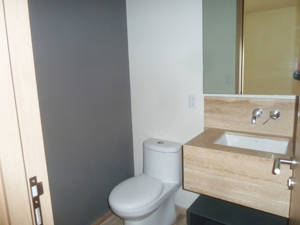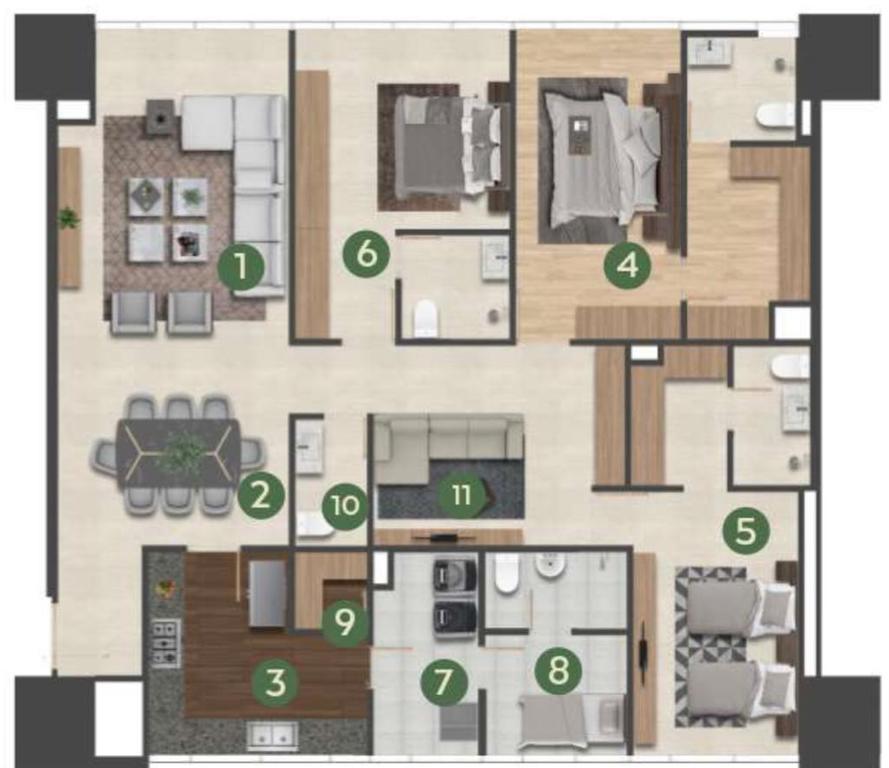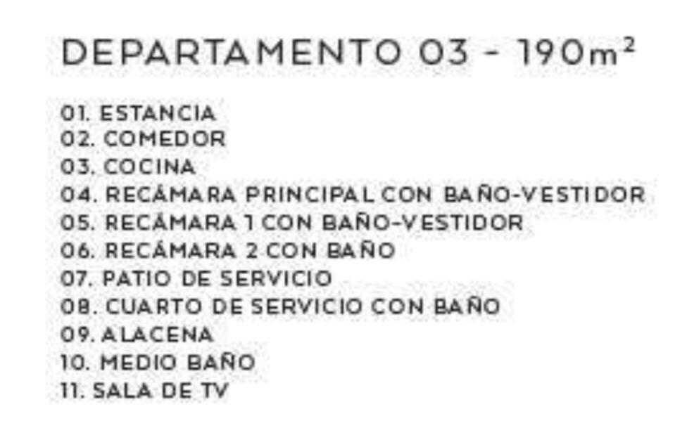 Departamento con finos acabados, sala, comedor, baño de visitas, cocina, sala de tv, 3 recámaras, 2 con vestidor y baño y 1 con closet y baño, área de lavado, cuarto de servicio con baño, 2 lugares de estacionamiento. Se entrega sin closets y sin canceles de baño.