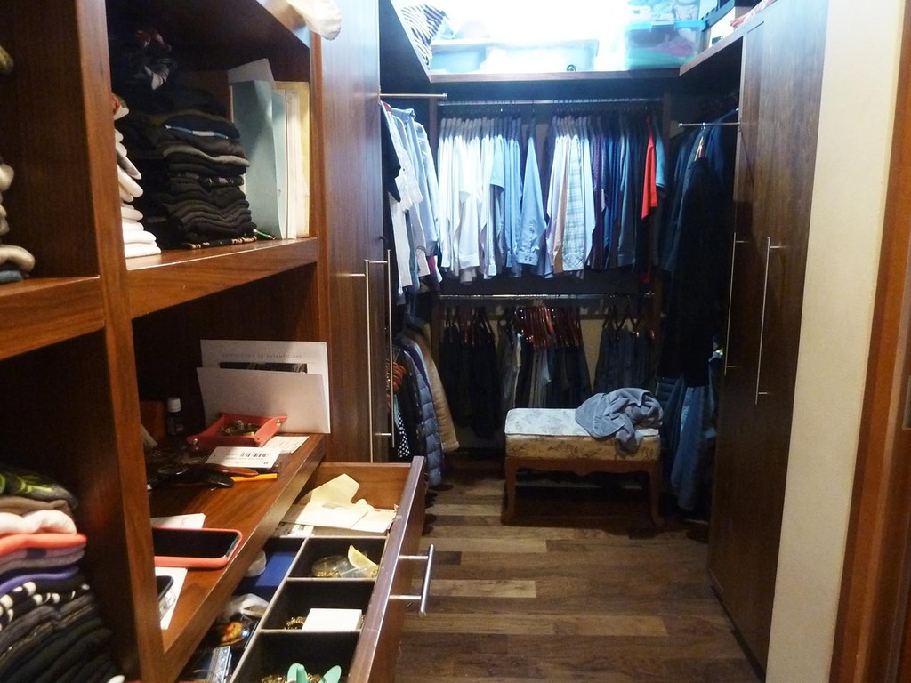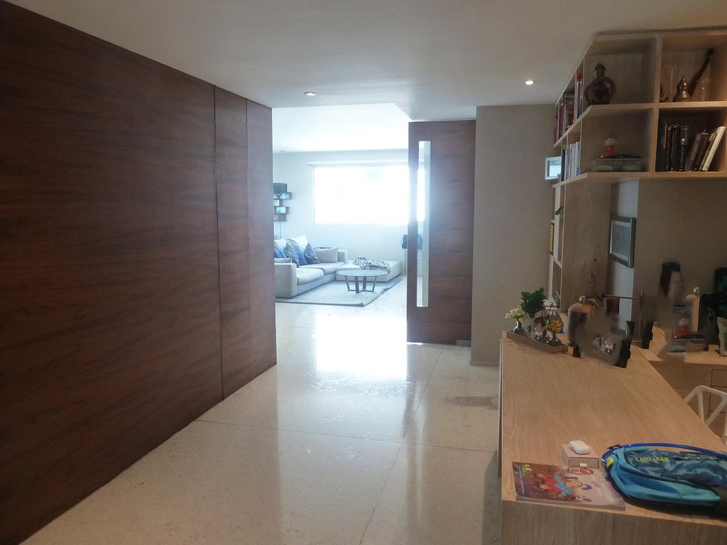Entrada principal, baño de visitas, piso de placas grandes de mármol mate, 3 closets de blancos, oficina, sala, comedor con family room, cocina integral, recámara 1 con closet y baño, recámara 2 con closet y baño, recámara 3 la principal con piso de madera, baño con doble tarja, vestidor grande, área lavado, cuarto servicio con closet y baño, 3 cajones de estacionamiento y bodega grande.