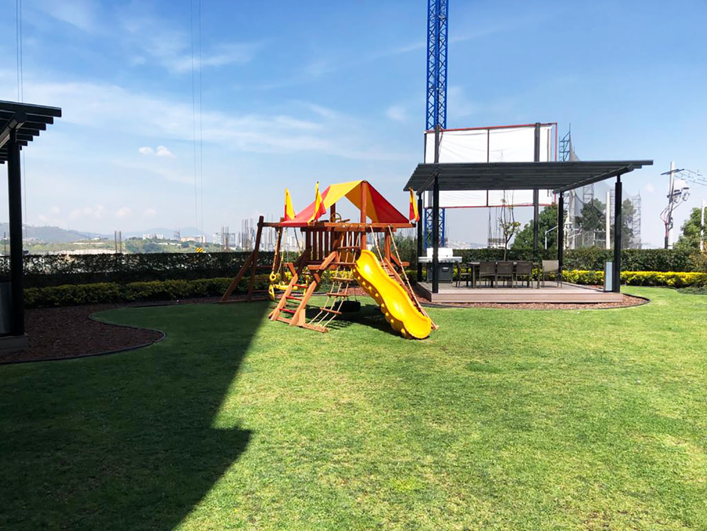 Áreas comunes: Salón de fiestas grande con cocina y baños, gimnasio, alberca cubierta, jardín con juegos infantiles, jacuzzi exterior, ludoteca, jardín con 2 quioscos para asadores, vigilancia 24/7.