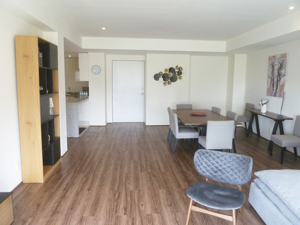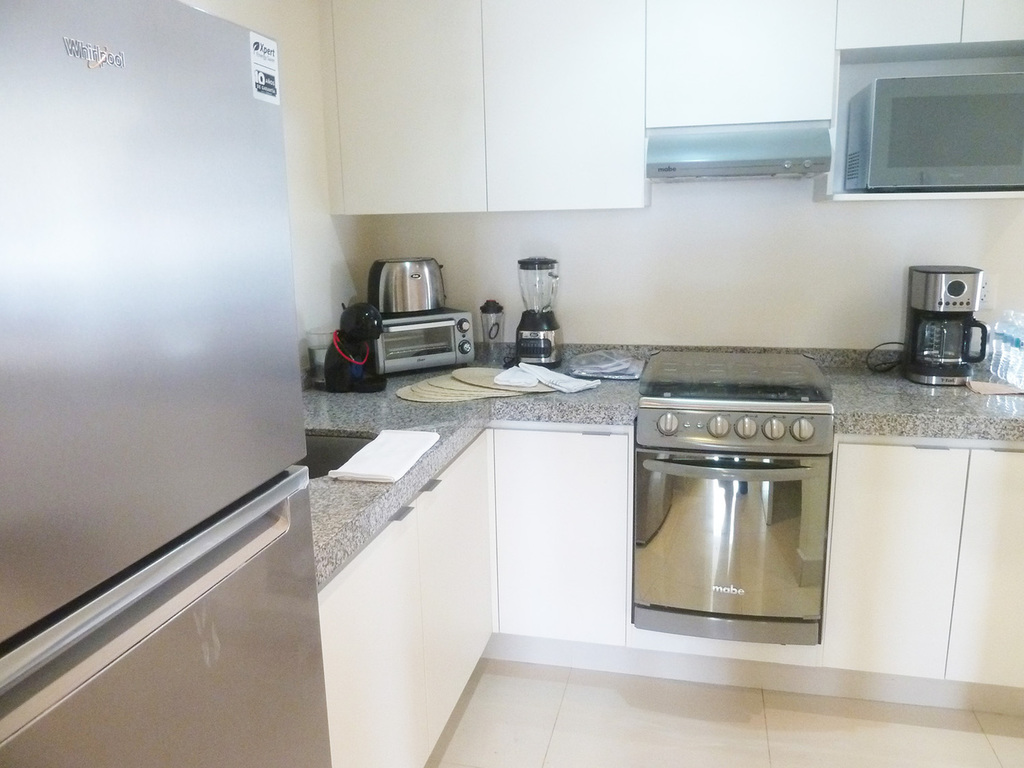 Departamento totalmente amueblado y equipado para estrenar, sala, comedor, cocina abierta, baño de visitas, 3 recamaras, recámara 1 con closet, recámara 2 con closet, baño completo que comparten las recamaras 1 y 2, recamara 3 la principal con amplio closet y baño, área de lavado y cuarto de servicio con baño, 1 lugar de estacionamiento.
